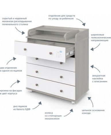 Oрион — пеленальный комод с удобными, вместительными ящиками и откидным пеленальным столиком с возможностью установки на правую и левую сторону.