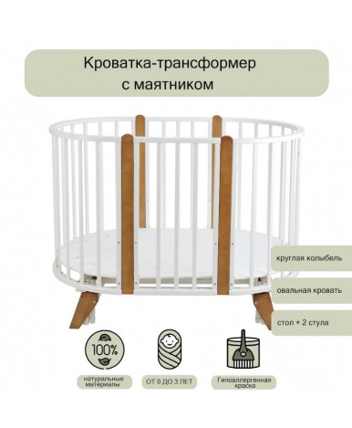 Детская кроватка «8 в 1». Кроватка выполнена из массива северной берёзы и МДФ. Закругленный края деталей не позволят Вашему малышу удариться. В первые месяцы жизни в круглой кроватке малыш чувствует себя очень комфортно! Семь вариантов трансформации позволяют использовать кроватку продолжительное время.