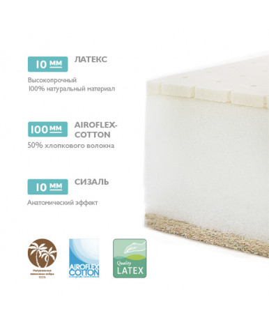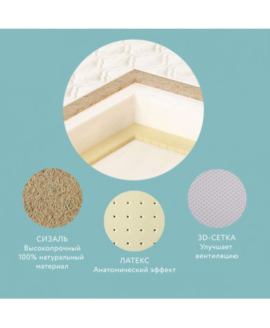 Ортопедический двусторонний матрас для детей от рождения до 3-4 лет. Особенность модели в сочетании натуральных материалов и новейших разработок, которые вместе обеспечивают здоровый и комфортный сон ребенка. Сердцевина матраса — материал Airoflex-Cotton, его монолитный блок гарантирует надежную поддержку и ровную поверхность весь срок службы матраса. Этот инновационный наполнитель прекрасно держит форму, он упругий и долговечный, а натуральный хлопок в составе (50%) улучшает его вентиляцию. Натуральные материалы по двум сторонам позволяют достичь разницы в жесткости, что делает матрас универсальным и продлевает время его службы. Для новорожденных мы рекомендуем сторону с сизалем (жесткость 5 из 5). Это самый прочный из всех существующих натуральных наполнителей. Результат — надежная поддержка позвоночника и максимальный ортопедический эффект. По качественным характеристикам он отлично подходит для матрасов: сизаль не гниет, не проводит статическое электричество, не вызывает аллергию, прекрасно "дышит", не боится влаги и микробов. На второй стороне мы использовали слой латекса (10 мм, жесткость 4 из 5) для точечного распределения нагрузки, поэтому спать на нем удобно в любой позе. Слои наполнителей для удобства скреплены между собой специальным экологичным составом Simalfa (производство Швейцария). Состав на водной основе, без запаха, безопасен для ребенка и имеет сертификат качества. Стеганый съемный чехол выполнен из прочного и приятного на ощупь трикотажа. Натуральный хлопок в составе, а также 3D-сетка по периметру обеспечивают дополнительную вентиляцию наполнителей и способствуют созданию температурного баланса на поверхности матраса. Ничто не будет мешать спокойному сну малыша.