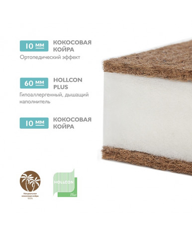 Латексированная кокосовая койра (из 8 слоев), 100% натуральный материал, состоящий из волокон кокосового ореха, скрепленных натуральным латексом – вспененным соком каучукового дерева. Обладает потрясающими антиаллергенными и бактерицидными свойствами, поскольку кокосовое волокно не гниет ни при какой влажности. Один из самых жестких, упругих и эластичных наполнителей, он идеально поддерживает позвоночник маленького ребенка во время сна. Кокосовая койра не деформируется в течение многих лет и обеспечивает отличную циркуляцию воздуха и теплообмен. Среди жестких наполнителей матрасов она занимает лидирующую позицию.