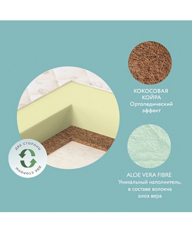 Латексированная кокосовая койра с одной стороны обеспечивает надежную поддержку позвоночника новорожденного. Это плотный и неприхотливый в уходе наполнитель, признанный одним из лучших по своим ортопедическим свойствам. Aloe Vera Fibre — упругий материал с содержанием и полезными свойствами алоэ вера. Препятствует образованию бактерий и прекрасно восстанавливает форму.