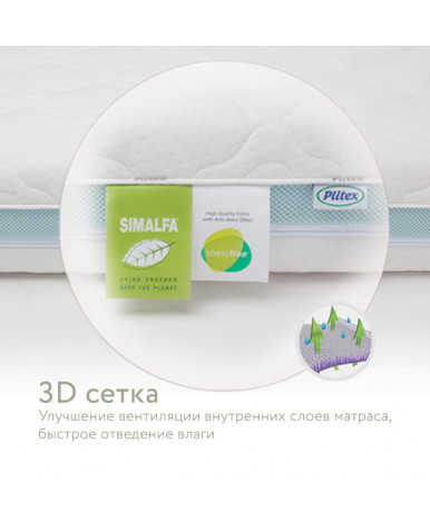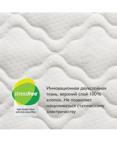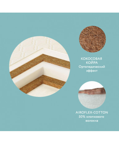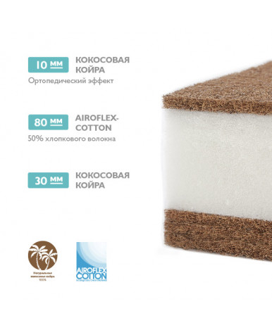 Двусторонний ортопедический матрас для детей от рождения. Самый жесткий матрас серии Eco. Его особенность — в том, что на обеих сторонах используется натуральная кокосовая койра, При этом слои различной толщины. Они обеспечивают различия в жесткости — стороны предназначены для использования в разном возрасте. С одной стороны модели слой кокосовой койры 30 мм — эта сторона обладает максимальными ортопедическими свойствами и рекомендуется для новорожденных (жесткость 5 из 5). После этого матрас стоит перевернуть на другую, более эластичную сторону (слой 10 мм. Жесткость 4 из 5). Натуральная кокосовая койра, скрепленная натуральным латексом, признана одним из лучших наполнителей для детских матрасов, кроме того, она очень неприхотлива в уходе. Упругие натуральные волокна хорошо держат форму, матрас остается как новый весь срок службы, спать на нем ребенку полезно и безопасно. Основа матраса выполнена из инновационного наполнителя Airoflex-cotton. Материал прекрасно держит форму, он упругий и долговечный, а натуральный хлопок в составе улучшает его вентиляцию. Стеганый чехол нового поколения StressFree тоже обладает особым свойством: он нейтрализует статическое электричество, даже если ребенок ворочается во сне. Верхний слой чехла – 100 % хлопок, на нем спать удобно в любую погоду. А специальная 3D сетка по периметру чехла создает дополнительный доступ воздуха к наполнителям. Кроме того, чехол на молнии по трем сторонам, это очень практично: вы можете снять его для стирки и надеть обратно. А в это время наполнители можно проветрить: они соединены между собой. Важно: слои скреплены специальным экологичным составом Simalfa (производство Швейцария). Состав на водной основе, без запаха, безопасен для ребенка и имеет сертификат качества. Матрас рекомендуется детям от 0 до 3-4 лет.