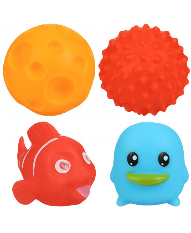 Мячики с рельефной массажной поверхностью способствуют развитию мелкой моторики и тактильных ощущений. Давление на фактурную поверхность мячиков стимулирует и благоприятно воздействует на нервные окончания, ответственные за большинство процессов в организме. Шарики имеют яркие цвета, которые способствуют развитию зрения, а пищалка внутри развивает слуховое восприятие.
