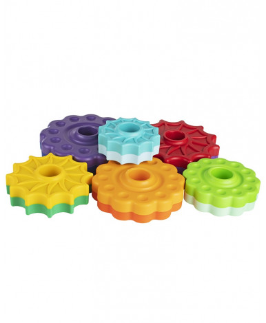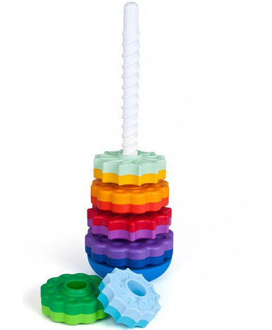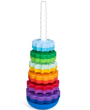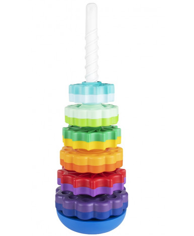 Пирамидка с голубым кольцом наверху. Развивающая пирамидка, состоящая из 6 двойных колец разного цвета, которые при кручении по стирали увлекают радужными переходами. Материал, из которого изготовлена продукция по данным производителя: Полипропилен, суперконцентрат (краситель) Материал, из которого изготовлена индивидуальная упаковка изделия: Блистерная упаковка, вкладыш (бумага) Комплектность изделия с указанием количества: основа - 1 шт., спираль - 1 шт., кольцо - 6 шт.