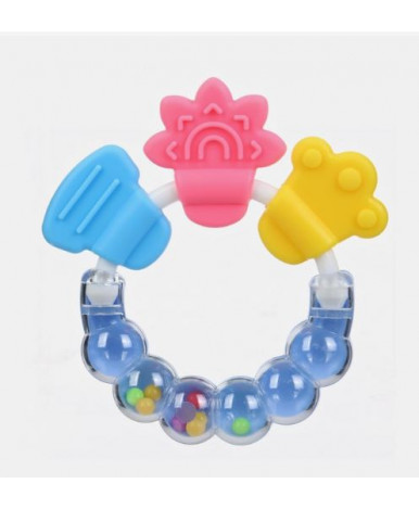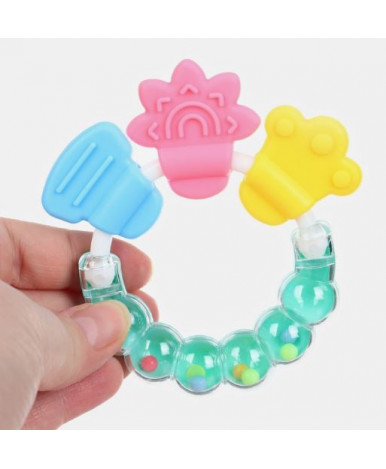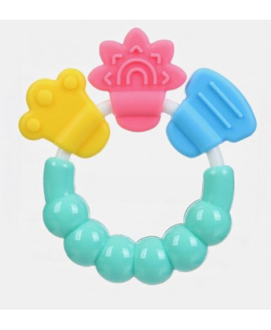 Прорезыватель-погремушка сочетает в себе сразу несколько функций: массаж дёсен, развитие мелкой моторики и координации. Его нежные голубые и зелёные цвета привлекают внимание малыша, а звуковые эффекты поддерживают интерес к игре.