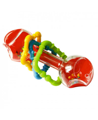 Оба конца гантельки снабжены мелкими шуршащими шариками, за которыми ребёнок может наблюдать. Это вызывает интерес и развивает остроту зрения. На рукоятке погремушки есть разъёмные элементы, которые будут увлекать и старших малышей.