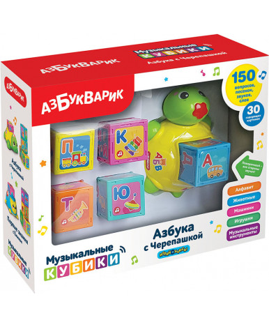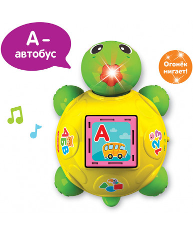 Умная черепашка при помощи 5 обучающих кубиков поможет малышу выучить буквы! Нужно просто вставить кубик и нажать!В игрушке — 30 говорящих картинок, 4 режима («Буквы и слова», «Звуки», «Песенки», «Игры»), а также мигающие огоньки и 10 песенок («Песенка про алфавит», «Песенка про счет», «Песенка про цвета», «Песенка про формы», «Веселые противоположности», «Это что за чудеса», «Выходите погулять», «Пляшут весело детишки», «Что такое праздник», «Друзья»). А еще с помощью кубиков ребенок сможет сам составлять слоги и слова.