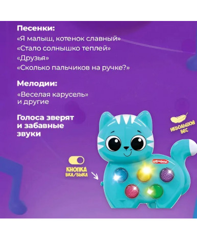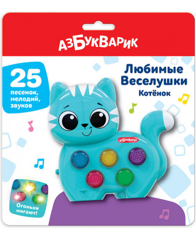 Музыкальный котенок из серии «Любимые Веселушки» мило улыбается и замечательно поет. Нажимая на разноцветные кнопочки, малыш послушает веселые песенки и мелодии («Я малыш, котенок славный», «Стало солнышко теплей», «Друзья», «Сколько пальчиков на ручке?», «Веселая карусель» и др.), а также множество забавных звуков и голосов зверят. Во время звучания песенок на кнопочках мигают огонькие. В игрушке 4 песни ,а еще 21 мелодия и забавные звуки.