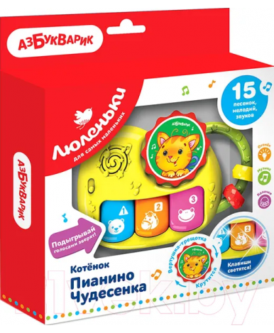 Миниатюрная игрушка-пианино разработана специально для малышей. Нажимая на яркие клавиши ребенок послушает 6 милых песенок о зверятах. Переключите режим – и на клавишах зазвучат веселые мелодии. Под них кроха сможет сам подыграть голосами зверят и смешными звуками. Эта игра не только развлекает, но и развивает у ребенка воображение и музыкальные способности. Во время звучания песенок и мелодий клавиши светятся. Также малышу понравится крутить колесико с забавной зверюшкой и слушать звук трещотки. А яркие колечки и рельефные элементы игрушки так приятно трогать детскими пальчиками! Пианино удобно носить с собой.
