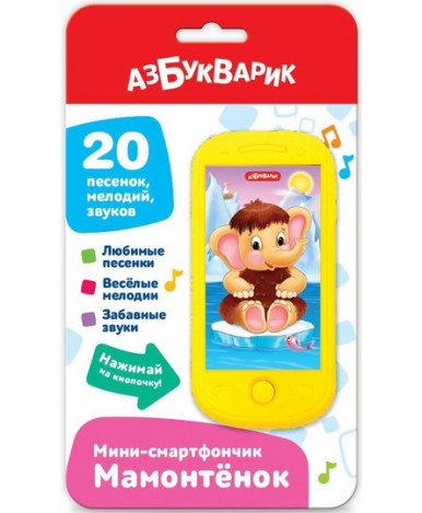 Компактный мини-смартфончик так удобно носить с собой. Он порадует малыша любимыми народными песенками («Мамонтёнок», «Ладушки», «Калинка», «Каравай», «Идет коза рогатая», «Ах, ты, совушка-сова») и мелодиями с забавными звуками («Чижик-пыжик», «Во саду ли, в огороде», «Два веселых гуся»). Нужно просто нажимать на кнопочку, слушать и подпевать. Всего в игрушке 20 песенок, мелодий, звуков.