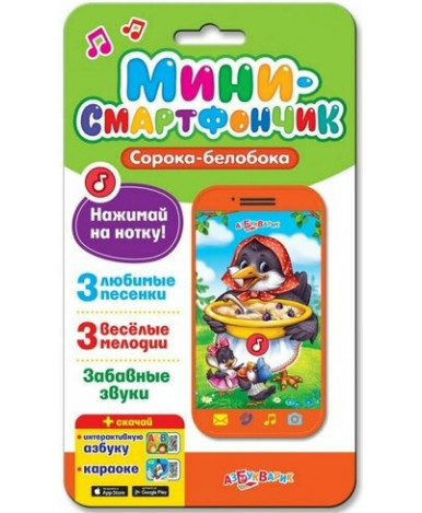 Компактный мини-смартфончик так удобно носить с собой. Он порадует малыша любимыми народными песенками («Сорока-белобока», «Ладушки», «Калинка», «Каравай», «Идет коза рогатая», «Ах, ты, совушка-сова») и мелодиями с забавными звуками («Чижик-пыжик», «Во саду ли, в огороде», «Два веселых гуся»). Нужно просто нажимать на кнопочку, слушать и подпевать. Всего в игрушке 20 песенок, мелодий, звуков.