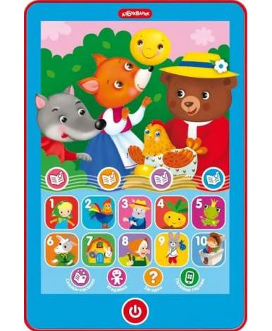 Нажимая на кнопочки и рассматривая яркие картинки, ребенок познакомится со сказочными героями, выучит цифры, послушает песенки-сказки и веселые фразы. Всего в планшетике собрано 6 песенок-сказок («Волк и семеро козлят», «Колобок», «Курочка Ряба», «Три медведя», «Репка», «Теремок»), 3 обучающие и развлекательные игры («Угадайка», «Волшебные загадки», «Позвони сказочным героям»), множество вопросов, загадок, веселых голосов и звуков.
