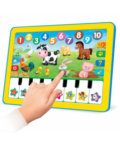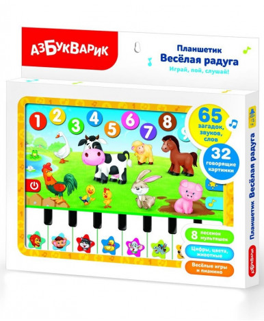 Вот это да! Игровой планшетик теперь с пианино! Нажимая на яркие картинки, ребёнок выучит цифры и цвета, познакомится с животными фермы, отгадает загадки. На клавишах пианино не только звуки, но и песенки мультяшек: «Песня Львёнка и Черепахи», «Песенка Мамонтёнка», «Здравствуй, детство!», «Танец маленьких утят», «Какой чудесный день!», «Песенка паровозика», «Человек собаке друг», «Колыбельная медведицы»!