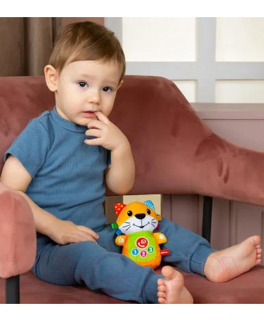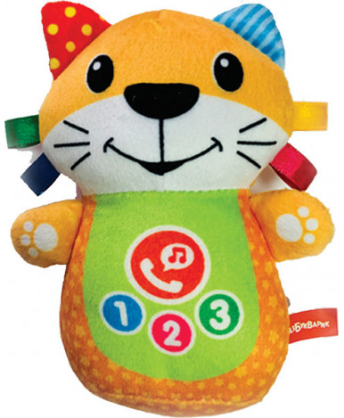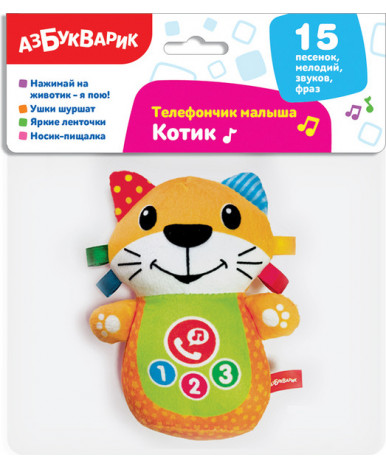 Необычный телефончик для самых маленьких — в виде мягкой музыкальной игрушки. Нажимая на телефонную трубку на животике котика, малыш сможет позвонить ему, а котик ему обязательно ответит и поговорит, и даже споет веселые песенки. При нажатии на носик котик будет забавно пищать. Всего в игрушке 15 песенок, мелодий и звуков.