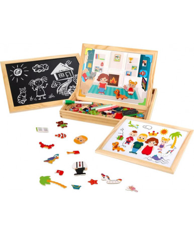 В набор входит магнитно-маркерная доска. При этом обратная сторона доски — грифельная, на ней можно рисовать настоящими мелками. В дополнение к магнитам в чемоданчике есть два цветных фона.