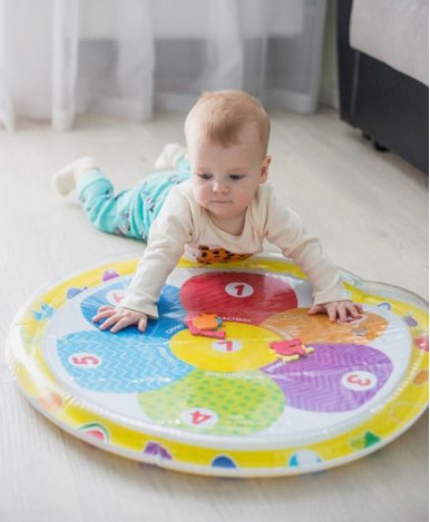 Для первого знакомства с акваковриком достаточно налить 1 литр теплой воды. Постепенно можно увеличивать количество воды в коврике. Через 2 недели можно попробовать налить 2 литра. И по мере роста малыша увеличить количество воды до 4 литров.