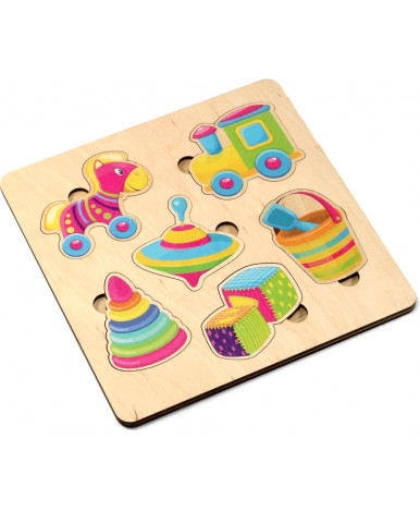 Деревянный пазл «Игрушки» — это простая развивающая игра для малышей от 3-х лет. Игра состоит из игрового поля-основы с углублениями и 6 фигурок детских игрушек. Задача ребёнка — правильно расставить все фигурки на игровом планшете. Чтобы фигурки было удобнее доставать из ячеек, в игровом поле имеются специальные пазы для детских пальчиков.