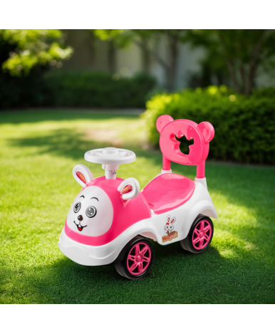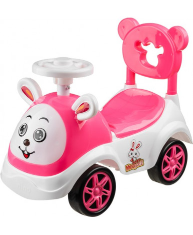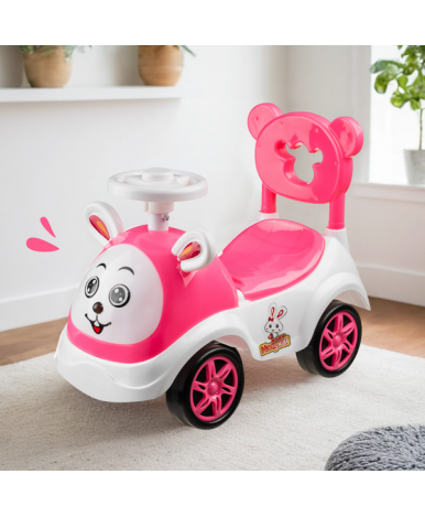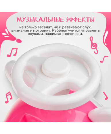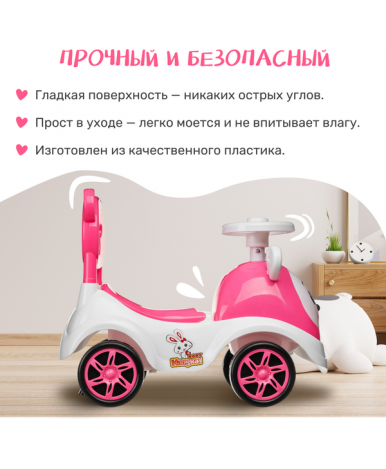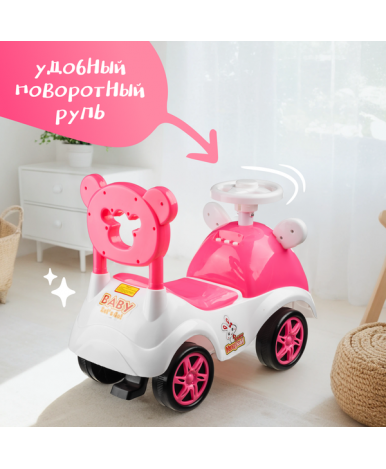 Детская каталка в виде машины подходит для активных игр. Модель представлена в белом цвете с яркими розовыми элементами и рисунками, которые привлекают внимание.
