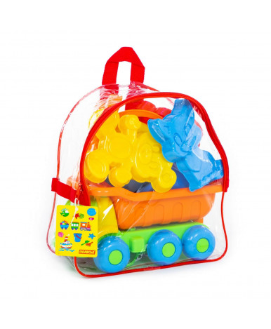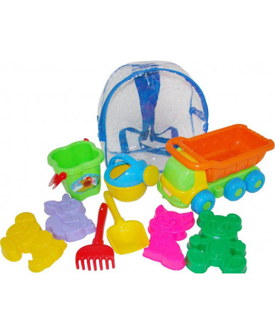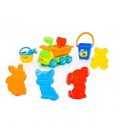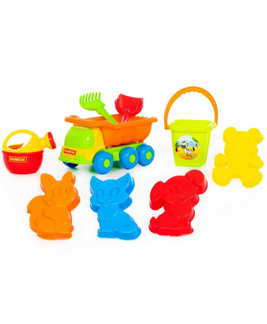 В наборе: автомобиль-самосвал + ведро-цветок среднее, лопатка №5, грабельки №5,