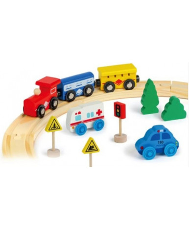 В наборе: локомотив (1 шт), вагон (2 шт), рельсы (8 шт), транспорт/техника (автомобиль — 2 шт), дерево/растение/цветок (5 шт), дорожный знак (3 шт)