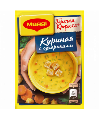 Горячие супы являются важной составляющей нашего рациона и содержат необходимые организму питательные вещества. MAGGI Горячая кружка куриная, в составе которой кусочки натуральных овощей, душистых трав и специй обладает насыщенным куриным вкусом и ароматом, в сочетании с хрустящими сухариками прекрасно утолит голод и согреет вас в любой ситуации. Не содержит консервантов.