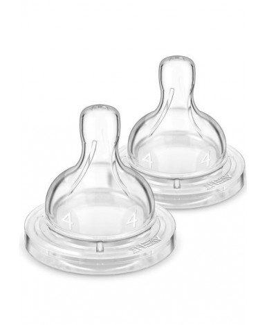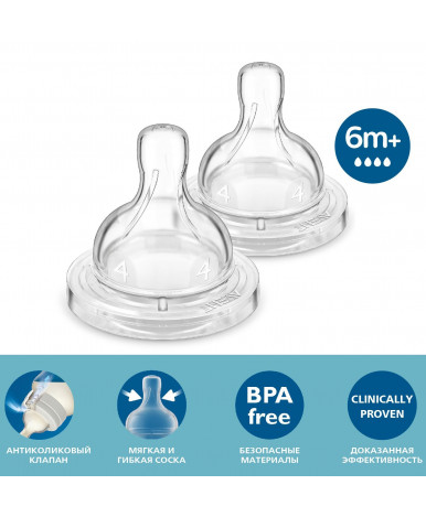 В комплекте 2 соски с быстрым потоком 6 мес+ с четырьмя отверстиями и маркировкой №4, со встроенным антиколиковым клапаном.