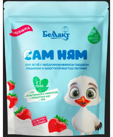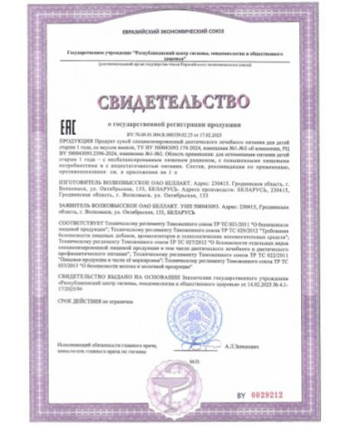 Состав: концентрат молочный; мальтодекстрин; сахар; растительные масла: соевое, кокосовое, высокоолеиновое подсолнечное; молочно–белковый концентрат сухой; концентрат сывороточных белков; среднецепочечные триглицериды; пребиотики: фруктоолигосахариды (ФОС); масло содержащее докозагексаеновую кислоту DHA (рафинированный рыбный жир, смесь токоферолов, L-аскорбилпальмитат); минеральные вещества: кальция хлорид, натрия цитрат; калия цитрат, магния хлорид; витаминный премикс: (С (L-аскорбат натрия), РР (никотинамид), D-пантотенат кальция, А (ретинола ацетат), В1 (тиамина мононитрат), В2 (рибофлавин); В6 (пиридоксин гидрохлорид), К (фитоменадион), Вс (фолиевая кислота), D3 (холекальциферол), Е (DL-альфатокоферола ацетат), В12 (цианкобаламин), D-биотин); витаминно-аминокислотный премикс (инозит, Lкарнитин, холина битартрат, таурин); минеральный премикс (меди сульфат, йодид калия, железа (II) сульфат, марганца сульфат, селенит натрия, цинка сульфат), ароматизатор«Ваниль»или«Клубника».
