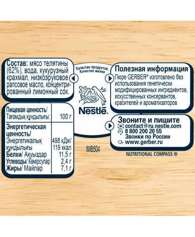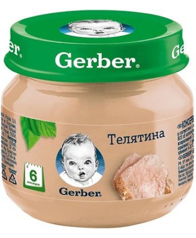 Мясное пюре Gerber Телятина 80 г. для питания детей старше 6 месяцев. ВАЖНОЕ ПРИМЕЧАНИЕ: идеальной пищей для грудного ребенка является молоко матери. Всемирная организация здравоохранения рекомендует исключительно грудное вскармливание в первые шесть месяцев и последующее введение прикорма при продолжении грудного вскармливания. Компания Нестле поддерживает данную рекомендацию. Для принятия решения о сроках и способе введения данного продукта в рацион ребенка необходима консультация специалиста. Мясо телятины богато полноценным белком и при этом нежирное. Телятина считается одним из лучших источников железа, а в сочетании с витамином В12 и медью в составе этого вида мяса помогает поддержать баланс железа и процесса кроветворения в организме ребенка. Телятина подходит для приучения к твердой пище, ведь она хорошо усваивается, а нежная консистенция пюре помогает малышу привыкнуть к новому продукту. Пюре изготовлено без использования генетически модифицированных ингредиентов, искусственных консервантов, красителей и ароматизаторов. Состав: мясо телятины (62 %), вода (35%), кукурузный крахмал, низкоэруковое рапсовое масло, концентрированный лимонный сок. Пищевая ценность (сред. состав на 100 г): энергетическая ценность - 119 ккал / 498 кДж; белки - 11,5 г; углеводы - 2,4 г; жиры - 7,1 г. Условия хранения: до вскрытия хранить при температуре от 6 до 30?. Открытую банку хранить в холодильнике не более 24 часов. Внимание! Не использовать продукт, если при открывании не произошло щелчка. Срок годности: Дата изготовления, срок годности см. на крышке. Начните кормление с 1 чайной ложки, постепенно увеличивая объем. Гомогенизированное. Стерилизованное. Готово к употреблению.