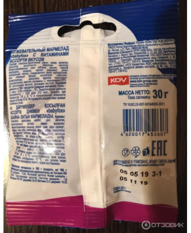 Состав: глюкозно-фруктозный сироп, сахар, желатин, регулятор кислотности: лимонная кислота; концентрирован-ные соки: яблочный, вишневый, апельсиновый, клубничный, лимона, черной смородины; агент желирую-щий: пектины; комплексная пищевая добавка (глазирователи: воск карнаубский, воск пчелиный, белый и желтый; антиокислители: альфа-Токоферол, Е304(i)); ароматизаторы, красители: каротины, медные ком-плексы хлорофиллинов, куркумин, лютеин, кармины; смесь концентрированных соков моркови, черной смородины; витамины: С, В6, ниацин, пантотеновая кислота, фолацин.