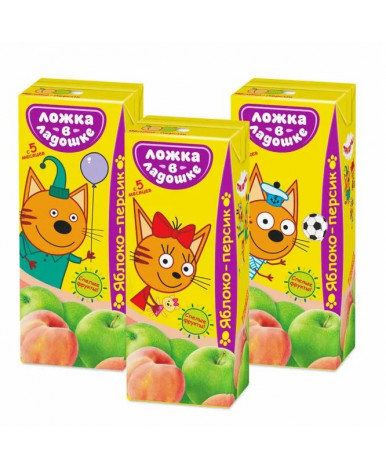 Состав: сок яблочный осветленный 25 %, пюре из персиков 19 %, пюре яблочное 5 %, сахар 6,12 %, вода питьевая