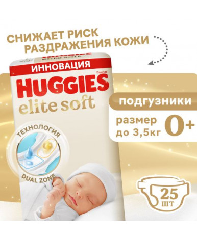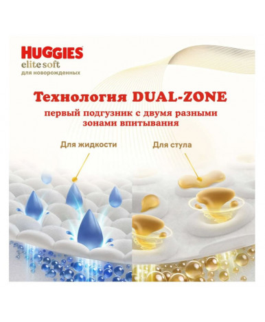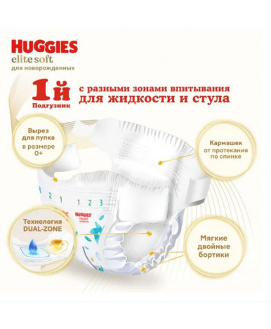 Новые подгузники Huggies Elite Soft 0 созданы для первых дней жизни малыша. Технология Dual Zone позволяет за секунды впитывать жидкость и стул, а мягкие подушечки обеспечивают комфорт и отсутствие раздражения на нежной и чувствительной коже новорожденных.