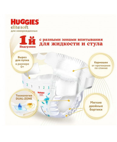 Новые подгузники Huggies Elite Soft созданы для первых месяцев жизни малыша. Технология Dual Zone позволяет за секунды впитывать жидкость и стул, а мягкие подушечки обеспечивают комфорт и отсутствие раздражения на нежной и чувствительной коже новорожденных.
