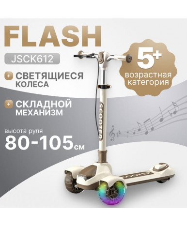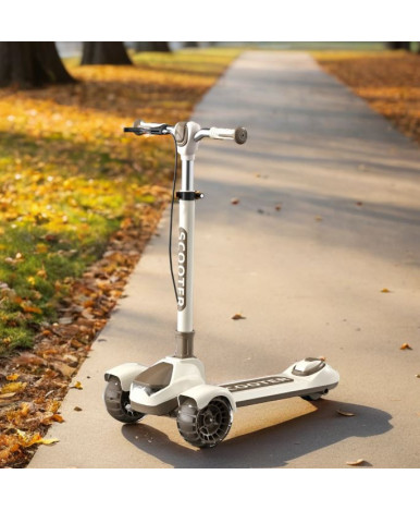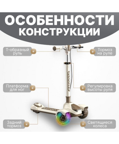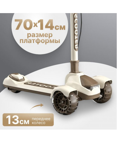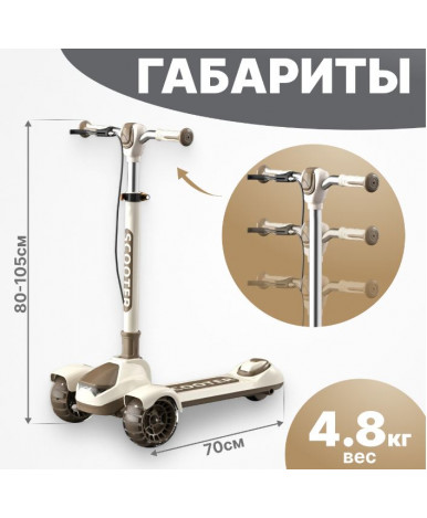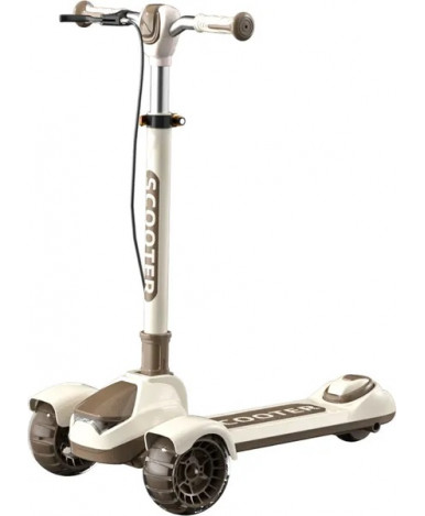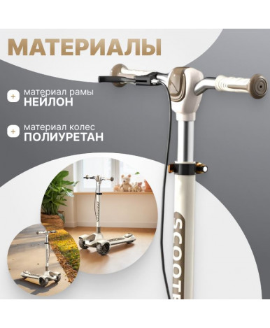 Детский самокат с тремя колесами подходит для детей от 5 лет. Рама из нейлона сочетает легкость и прочность, а бежевый цвет с коричневыми элементами делает модель универсальной и современной.