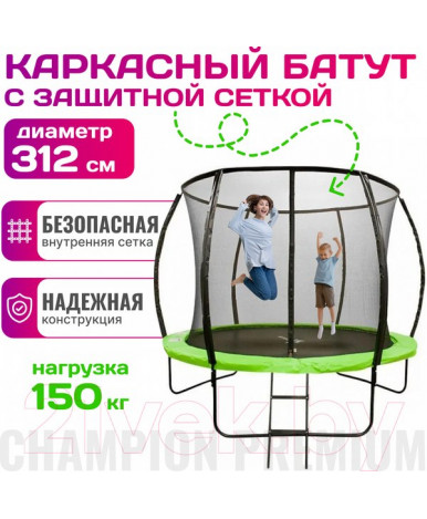 Батут Champion Premium-D312 — современное устройство для активного отдыха, предназначенное для использования в домашних условиях. Сочетание салатового и черного цветов придает изделию стильный вид, а прочная стальная рама с порошковым покрытием обеспечивает надежность и долговечность. Прыжковое полотно из полипропилена выдерживает максимальную нагрузку до 150 кг, что делает батут доступным для большинства пользователей.