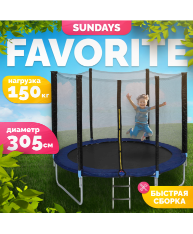 Батут Favorite 10FT — прочный и надежный спортивный инвентарь, предназначенный для активного отдыха и развлечений. Сочетание черного и синего цветов придает изделию современный и стильный вид, а качественные материалы обеспечивают долговечность и безопасность использования.Батут оснащен стальной рамой, которая выдерживает максимальную нагрузку до 150 кг, что делает его подходящим для взрослых и детей. Прыжковое полотно из полипропилена обеспечивает отличные отскоки и мягкость приземления, а 54 пружины длиной 140 мм