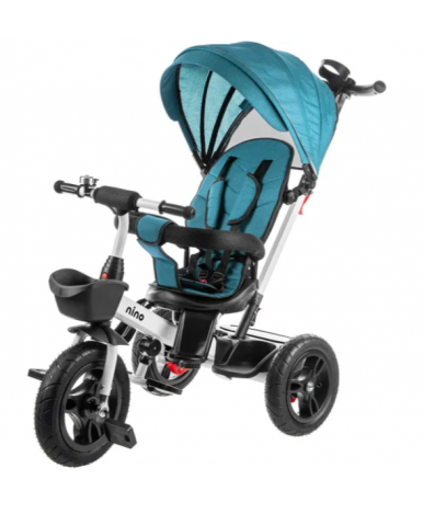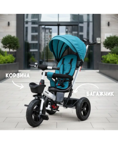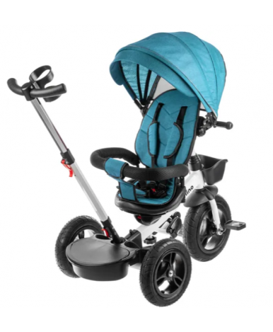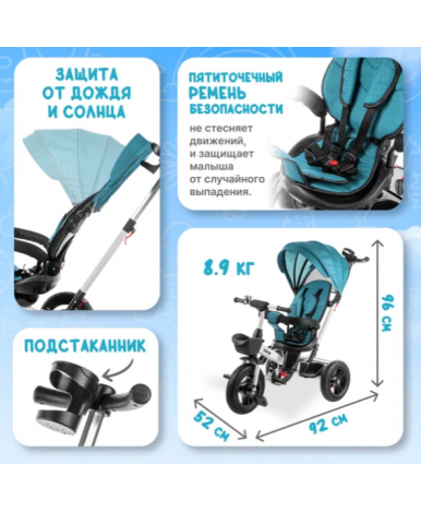 Надувные резиновые колеса (переднее колесо диаметром 30 см и задние 26 см) обеспечивают плавный ход. Комфортное сиденье со спинкой поворачивается, а высота педалей 8–15 см рассчитана на удобное вращение без лишней нагрузки на ноги. Бампер и пятиточечный ремень безопасности фиксируют малыша, а подставка для ног добавляет удобства. Капюшон защищает от солнца и дождя.