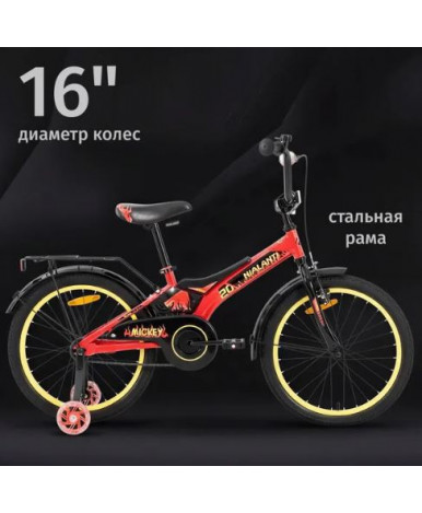 Детский велосипед для возраста от 4-х лет и роста от 101см с двумя основными колесами диаметром 16 дюймов и двумя дополнительными для устойчивости. Рама из стали открытого типа не складывается, что добавляет прочности и надежности всей конструкции, а также дает возможность легкой посадки.