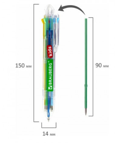 Ручка имеет прозрачный корпус, через который видны 8 цветных стержней. Сменный стержень длиной 90 мм. Диаметр пишущего узла 0,7 мм создает тонкую линию письма 0.35 мм. Автоматическая шариковая ручка со стержнями восьми различных цветов в одном корпусе позволит выделить важную информацию в записях.