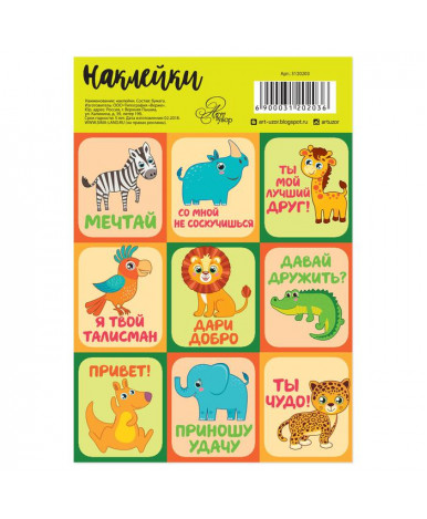 Девять наклеек-оценок на плотной бумаге самоклеющейся. Размер: 11х16см. Раскраска на обороте.