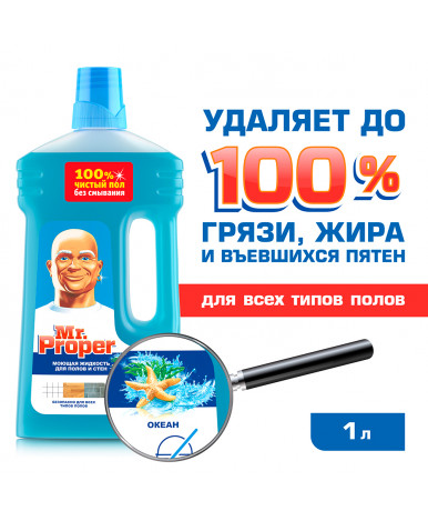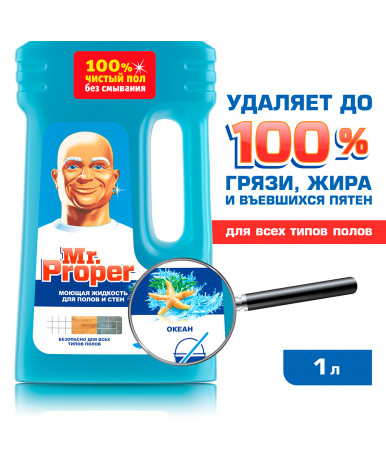 Mr. Proper чистота и блеск — жидкое средство для уборки различных поверхностей с приятным свежим ароматом. Средство отмывает полы и стены за меньшее время и с меньшими усилиями чем другие средства. Оно эффективно удаляет загрязнения, не оставляет разводов и главное — его не нужно смывать. Благодаря специальной безвредной pH формуле моющее средство Mr. Proper подходит для уборки различных поверхностей, включая лакированный паркет и ламинат. Для начала уборки разведите 2 колпачка средства в 5 л воды. После протирания дайте поверхности высохнуть.