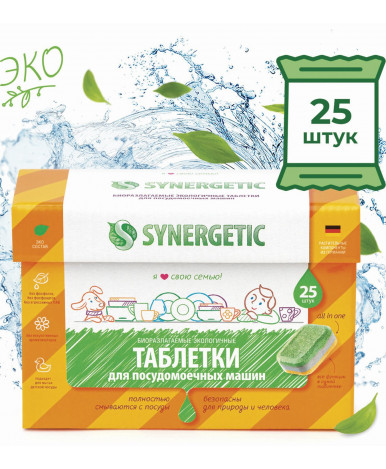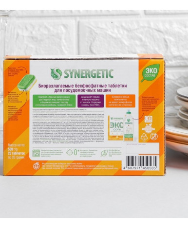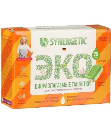 Биоразлагаемые бесфосфатные таблетки для посудомоечных машин предназначены для мытья посуды и столовых приборов в посудомоечных машинах любого типа. Таблетки удаляют сложные загрязнения, растворяют жир, качественно и бережно очищают посуду и столовые приборы, придают блеск. Не оставляют разводов, известкового налета и нейтрализуют запахи. Не содержат синтетических ароматизаторов и хлора. Защищают машину от накипи. Биоразлагаемые компоненты не вредят микрофлоре септических установок. При использовании таблеток не требуется добавление соли и ополаскивателя, но для достижения наилучшего результата и при очень жесткой воде рекомендуется применение специальной соли и ополаскивателя Synergetic.