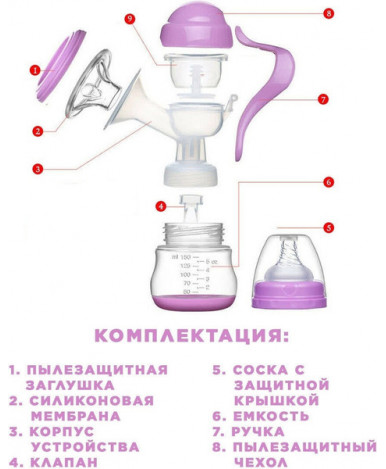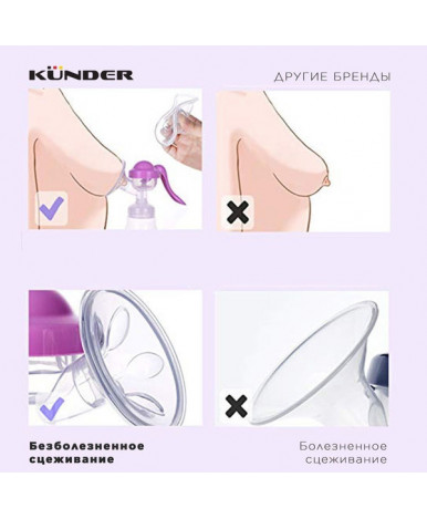 Ручной молокоотсос kunder удобный, портативный и компактный. Молокоотсос прост в эксплуатации, сборке и уходе. В комплекте идет бутылочка для кормления с соской. Мягкая силиконовая накладка обеспечит комфортное сцеживание и создаст необходимый вакуум. Молокоотсос kunder особенно актуален при лактостазе и застое грудного молока. Молокоотсос не имеет посторонних запахов и не содержит в составе пластика бисфенол А. Молокоотсос прошел все лабораторные испытания. Молокоотсос рекомендован к приобретению при сборе в роддом.